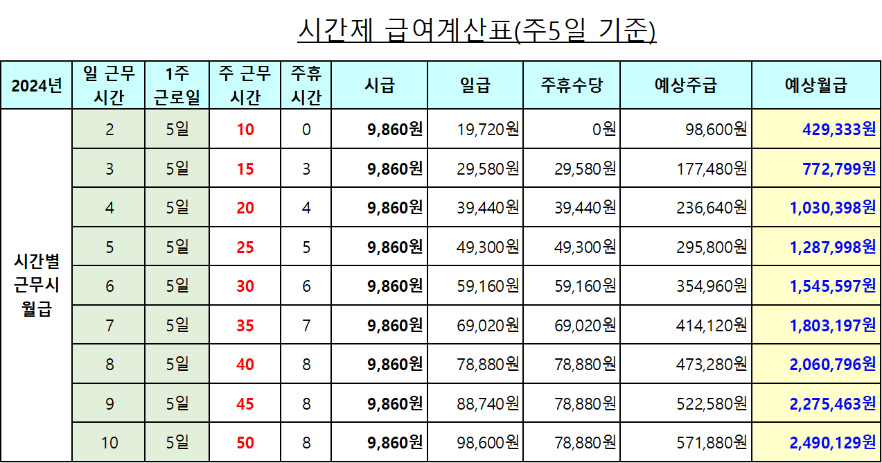 최저임금이 시간당 9860원으로 결정됨에 따라 주 5일 근무를 기준으로 아르바이트 급여에 미치는 영향을 살펴봅시다. 아래는 주당 근무 시간에 따른 아르바이트 시급을 보여주는 계산표입니다: